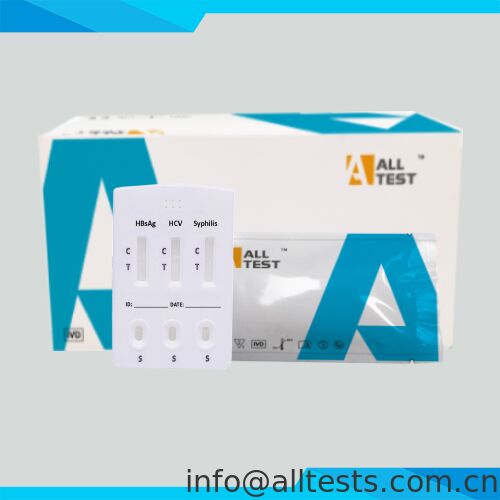 HBsAg/HCV/Syphilis Combo Rapid Test Cassette (Whole Blood/Serum/Plasma) is a rapid chromatographic immunoassay for the qualitative detection of Hepatitis B surface antigen (HBsAg), antibodies to Hepatitis C Virus and syphilis antibodies (IgG and IgM) to Treponema Pallidum (TP) in whole blood, serum or plasma.